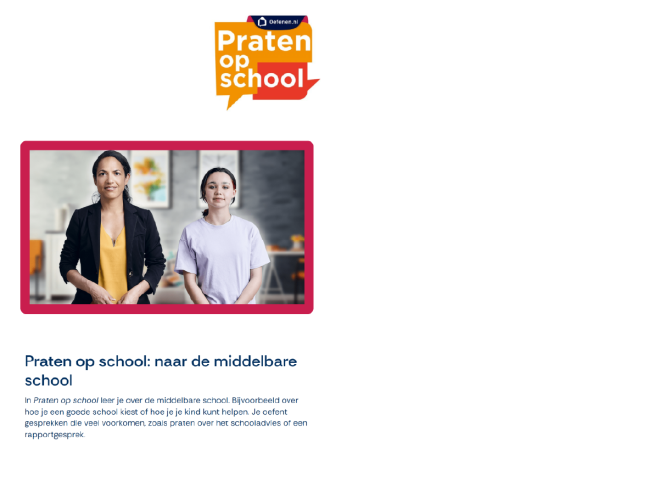 Praten op school: de middelbare school is een online programma, en onderdeel van Oefenen.nl. Anderstalige ouders leren hoe zij hun kind goed kunnen begeleiden op de middelbare school. Ze leren over het onderwijs in Nederland en welke rol zij daarin kunnen nemen. Er is ook extra materiaal zoals praktijkopdrachten, taalkaarten en een woordenlijst.