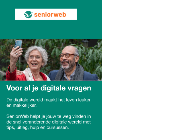 SeniorWeb helpt senioren om hun weg te vinden in de snel veranderende digitale wereld. Zij bieden bijvoorbeeld cursussen digitale vaardigheden; online, aan huis of in de buurt. Zij bieden ook PC-hulp per telefoon, via internet of aan huis. Ook staan er veel tips op de website seniorweb.nl. Voor een deel van de dienstverlening moet je lid zijn van SeniorWeb.