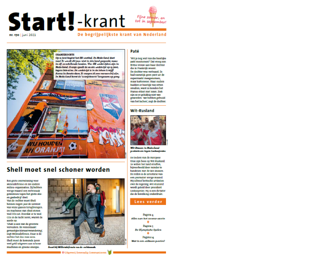 De Start!-krant is een gedrukte krant die 10 keer per jaar verschijnt. De krant bevat een mix van nieuws en entertainment in een kleurige, overzichtelijke vormgeving. De zinnen zijn kort. Moeilijke woorden worden waar mogelijk vermeden of verklaard in een woordenlijst.
