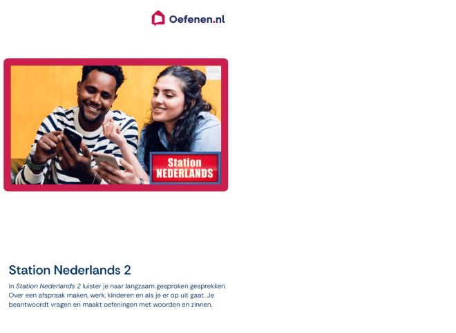 Station Nederlands 2 is een online programma, en onderdeel van Oefenen.nl. In Station Nederlands 2 luister je naar langzaam gesproken gesprekken. Over een afspraak maken, werk, kinderen en als je er op uit gaat. Je beantwoordt vragen en maakt oefeningen met woorden en zinnen.