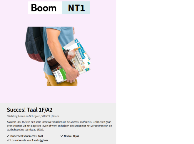 - Link naar website https://www.boom.nl/nt1/lesmateriaal/taal/alle-titels/101-240_Succes-Taal-1F-A2